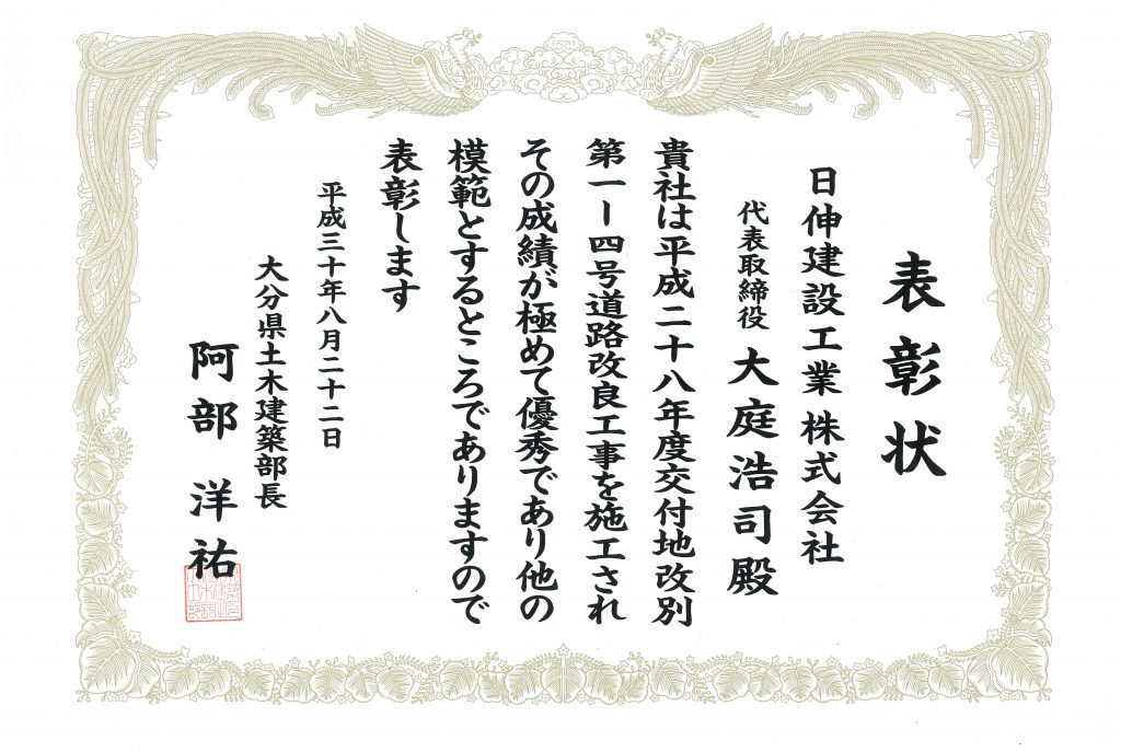 平成30年大分県土木建築部優良建設工事表彰されました